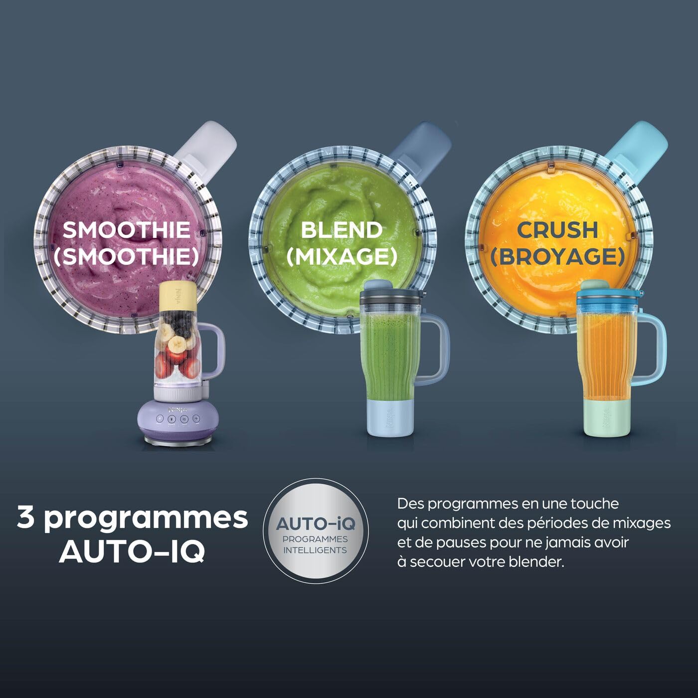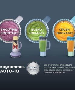 - TECHNOLOGIE AUTO-IQ : Préparez facilement des smoothies, de la glace pilée et des shakes protéinés grâce à 3 programmes automatiques du blender : Smoothie (Smoothie), Blend (Mixage) et Crush (Broyage) et mode Pulse (Impulsion) manuel.